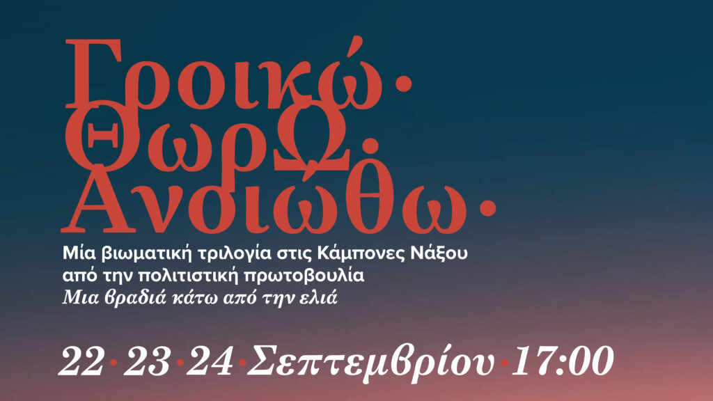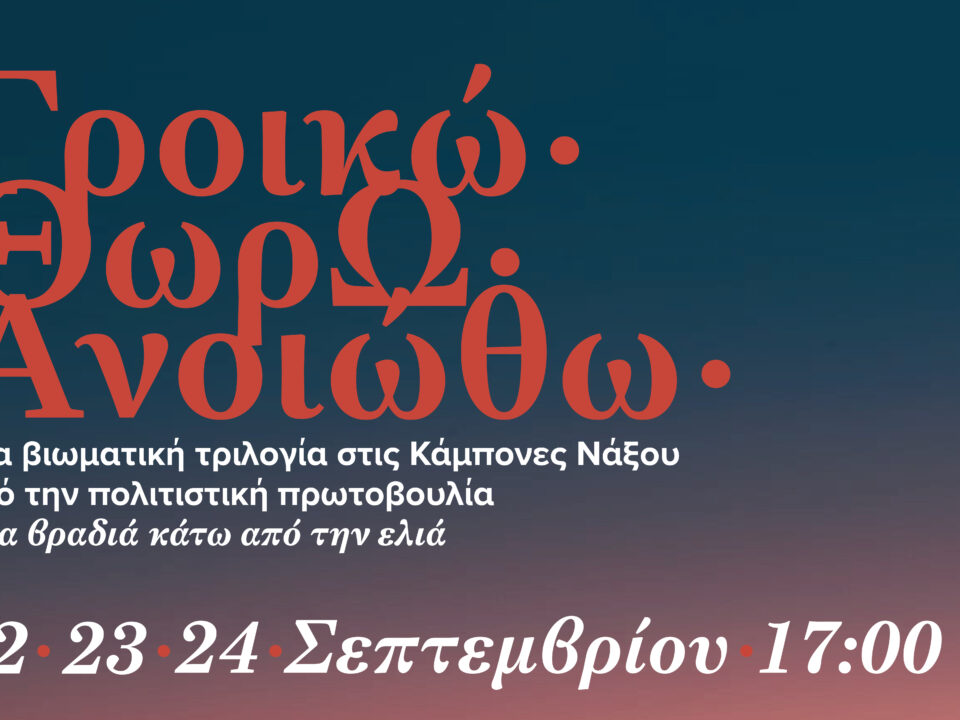 Η πολιτιστική πρωτοβουλία «Μια βραδιά κάτω από την ελιά» διοργανώνει φέτος τον Σεπτέμβριο τη βιωματική τριλογία «Γροικώ, Θωρώ, Ανoιώθω» στο Κτήμα Καμπόνες. Αυτές οι τρεις θεϊκές, […]
