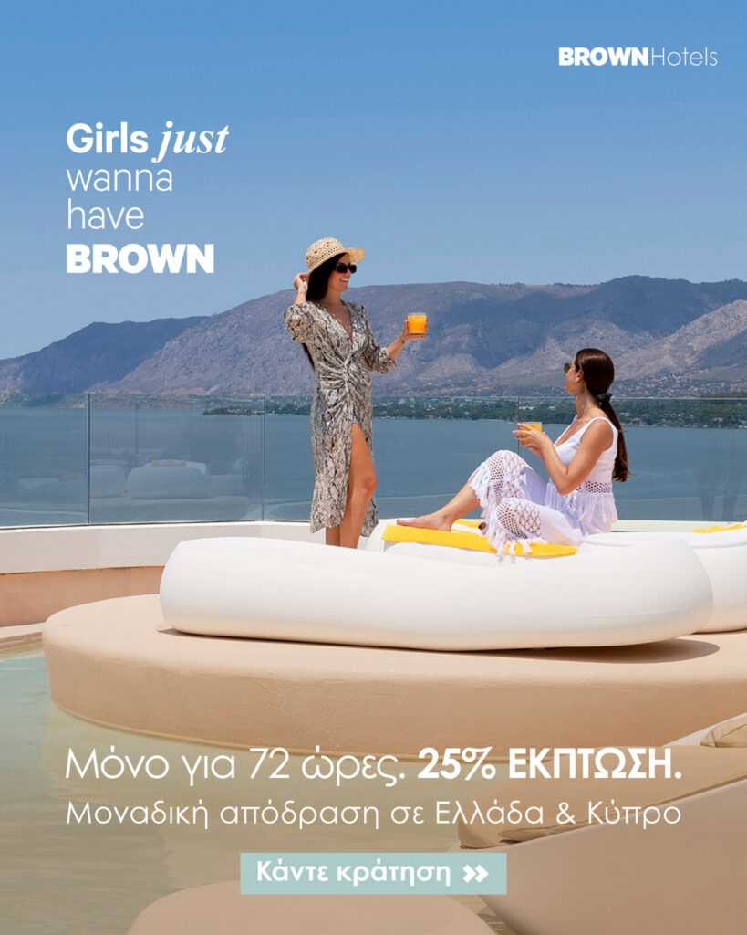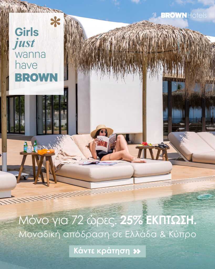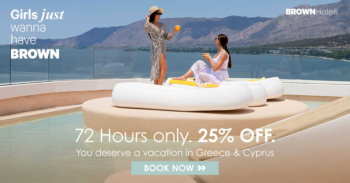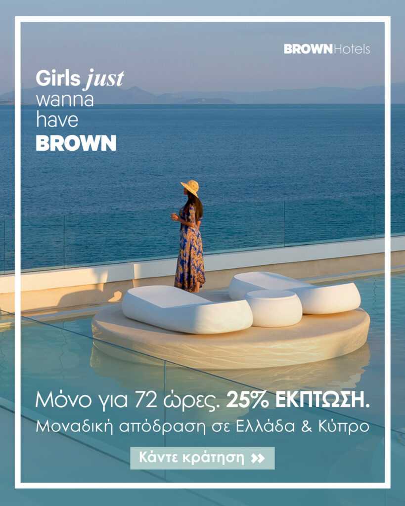 Με αφορμή την Παγκόσμια Ημέρα της Γυναίκας, η Brown Hotels παρουσιάζει την 72ωρη flash sale καμπάνια “Girls just wanna have BROWN”, προσφέροντας 25% έκπτωση σε όλα τα Brown Hotels στην Ελλάδα και την Κύπρο.