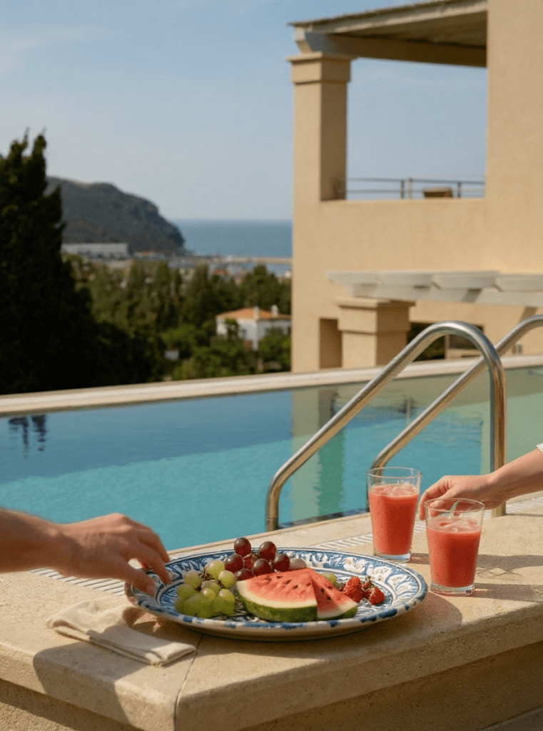 Στη βίλα Λιβάδι, τα κεραμικά Calopsia Finesse και το art de la table της ελληνικής εταιρείας Crini and Sophia δημιουργούν μια αίσθηση απέριττης πολυτέλειας, σε αρμονία με το κυκλαδίτικο φως.