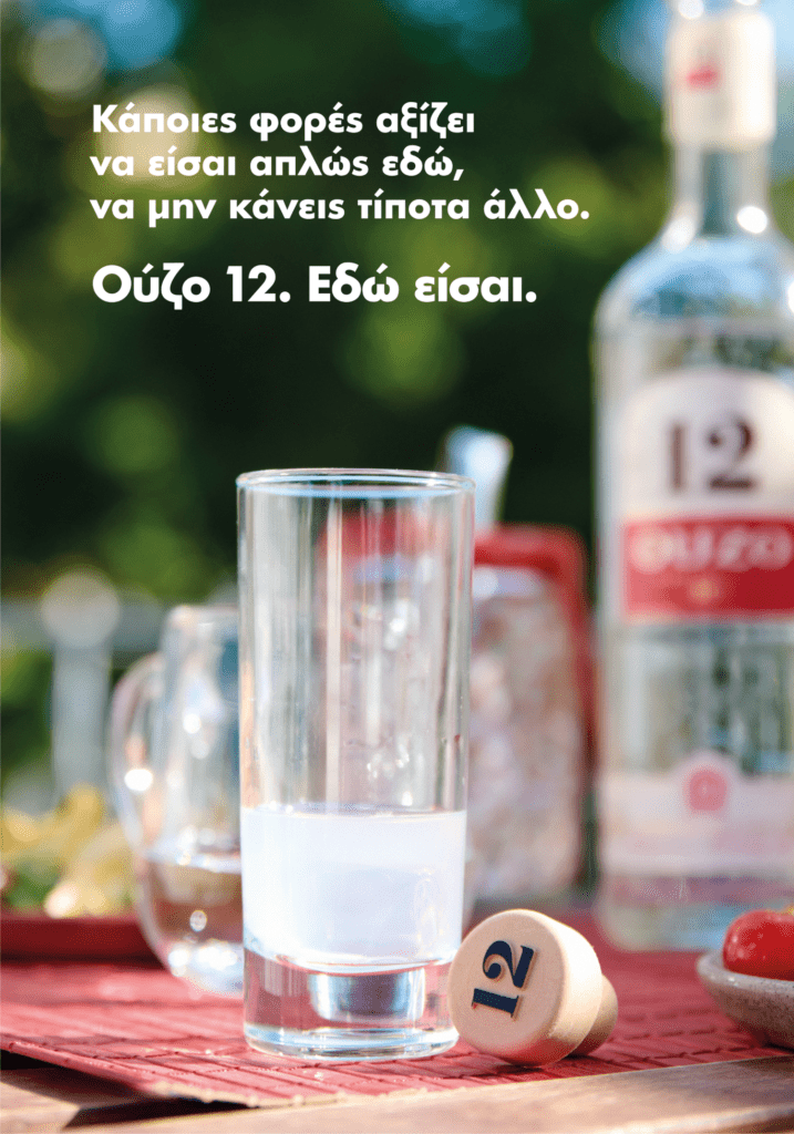 Η επικοινωνιακή πλατφόρμα «Εδώ Είσαι.» εστιάζει στη δύναμη της στιγμής. Στις αυθεντικές, απλές, καθημερινές στιγμές που αποκτούν αξία όταν τις μοιραζόμαστε: ένα ουζάκι με φίλους, ένα τραπέζι με καλή παρέα. Το Ούζο 12 μας καλεί να σταθούμε στο παρόν και να το ζήσουμε ουσιαστικά.