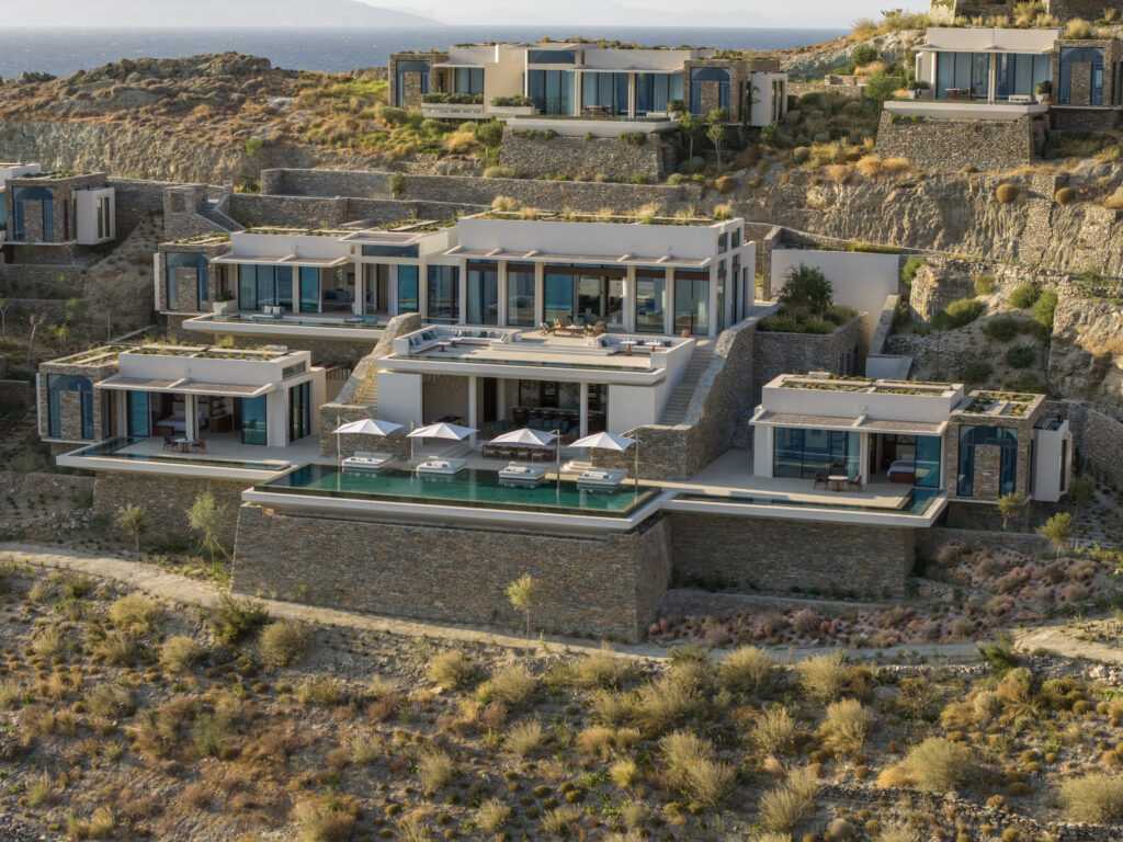 Κάθε υπνοδωμάτιο διαθέτει το δικό του patio, ιδιωτικό μπάνιο και εξωτερικό χώρο, ενώ τα μεγάλα παράθυρα από το δάπεδο έως την οροφή γεμίζουν τους εσωτερικούς χώρους με φυσικό φως και απρόσκοπτη θέα στο Αιγαίο. Στο κέντρο του εξωτερικού χώρου βρίσκεται μια ιδιωτική infinity πισίνα με θέα στη θάλασσα, ενώ οι διαδοχικές βεράντες, οι χώροι χαλάρωσης και η εξωτερική τραπεζαρία δημιουργούν το ιδανικό σκηνικό για στιγμές ψυχαγωγίας και χαλάρωσης.